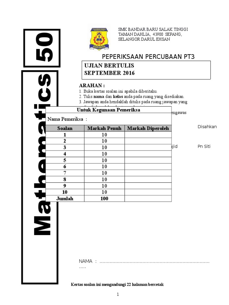 Soalan Percubaan PT3 Matematik SBP 2016. Kertas soalan ini adalah dalam dwibahasa bahasa Melayu dan bahasa Inggeris. This year will be the first time that this subject will be offered as a PT3 subject.